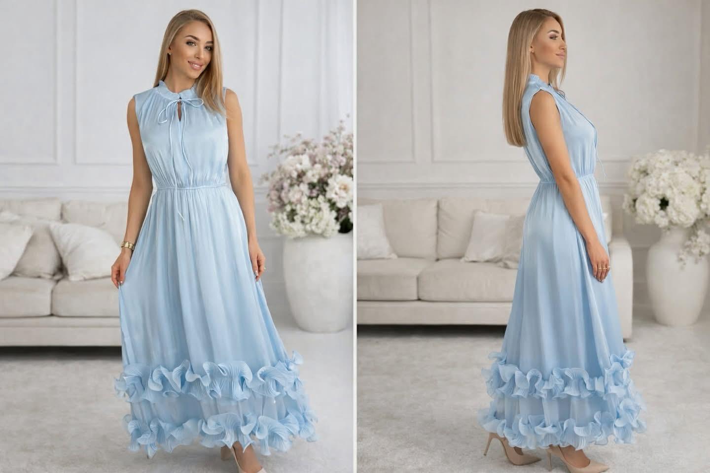 Tento model je stvorený pre ženy, ktoré chcú pôsobiť nežne, romanticky a zároveň luxusne. Šaty kombinujú ľahkosť materiálu s výraznými ozdobnými prvkami, ktoré okamžite upútajú pozornosť na každej spoločenskej udalosti.