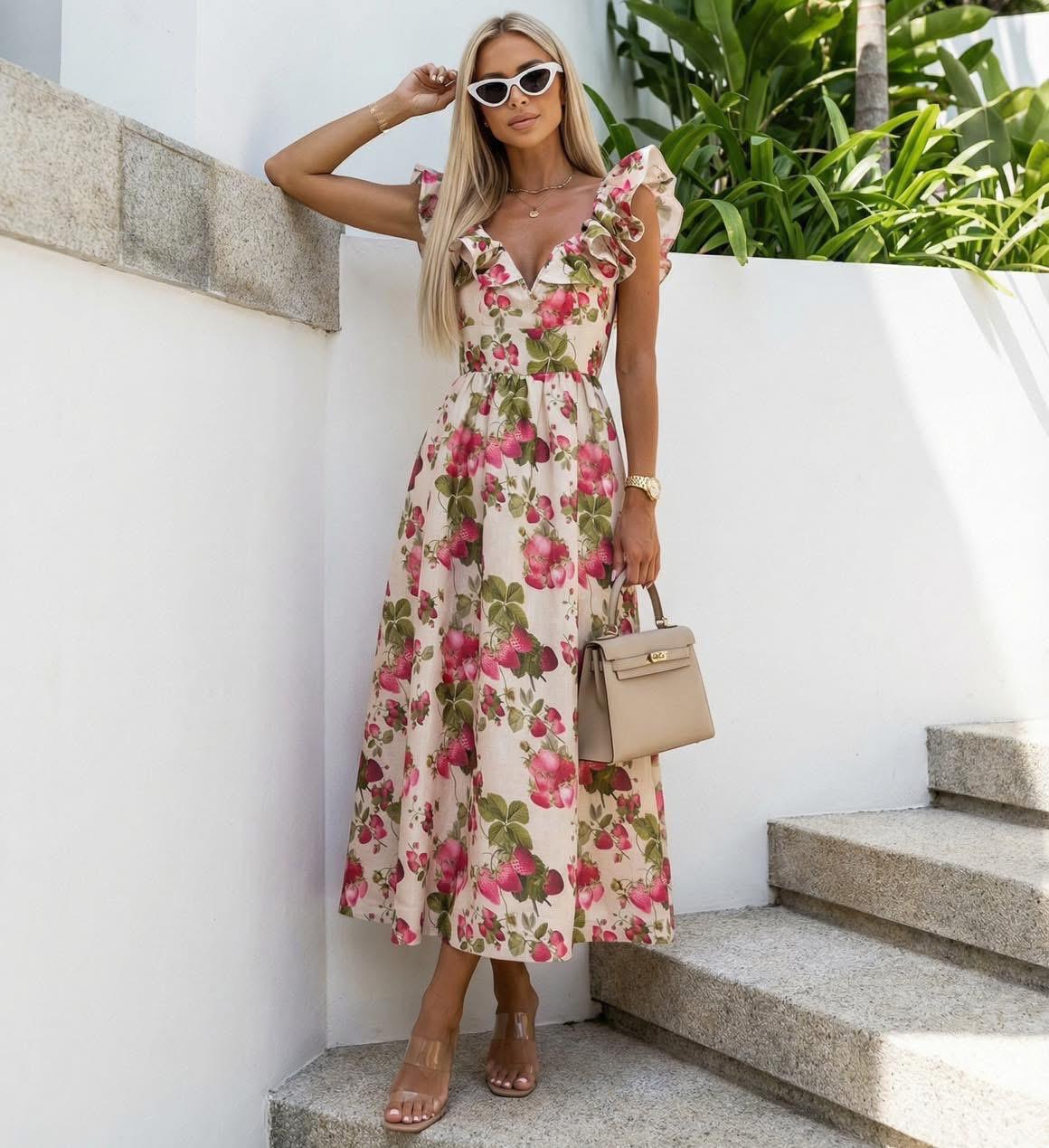 Náš tip: Šaty vyniknú s jednoduchými sandálmi alebo šľapkami. Do ruky si vezmite malú kabelku v krémovej farbe a outfit doplňte slnečnými okuliarmi pre dokonalý letný vzhľad.